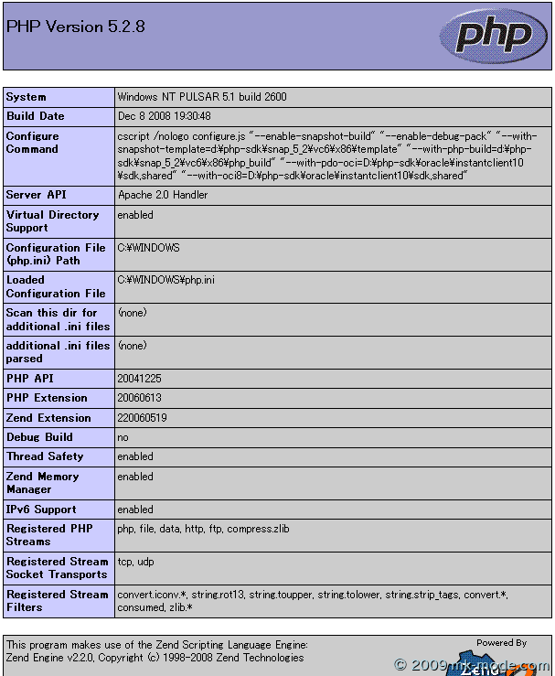 ブラウザから 「 http://localhost/phpinfo.php 」もしくは 「 http://127.0.0.1/phpinfo.php 」 にアクセスし、以下のようなPHP情報の画面がでればOK!