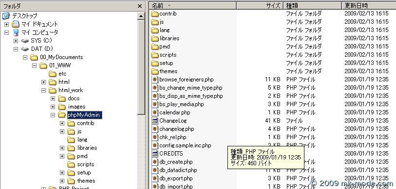 展開されたフォルダはフォルダ名が長いので、適当な名前に変更して、Webサーバのドキュメントルートへコピーする。 ※うちの場合、フォルダ名を「 phpmyadmin 」にして、ドキュメントルート「 D:\00_MyDocuments\01_WWW\html_work 」にコピーした。