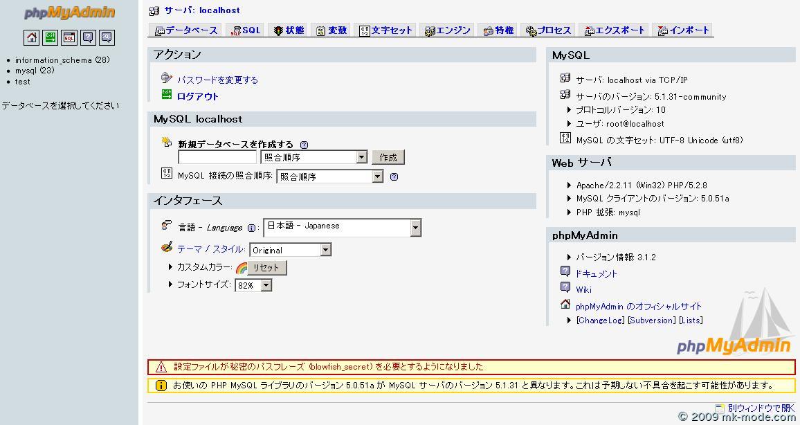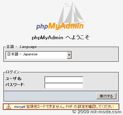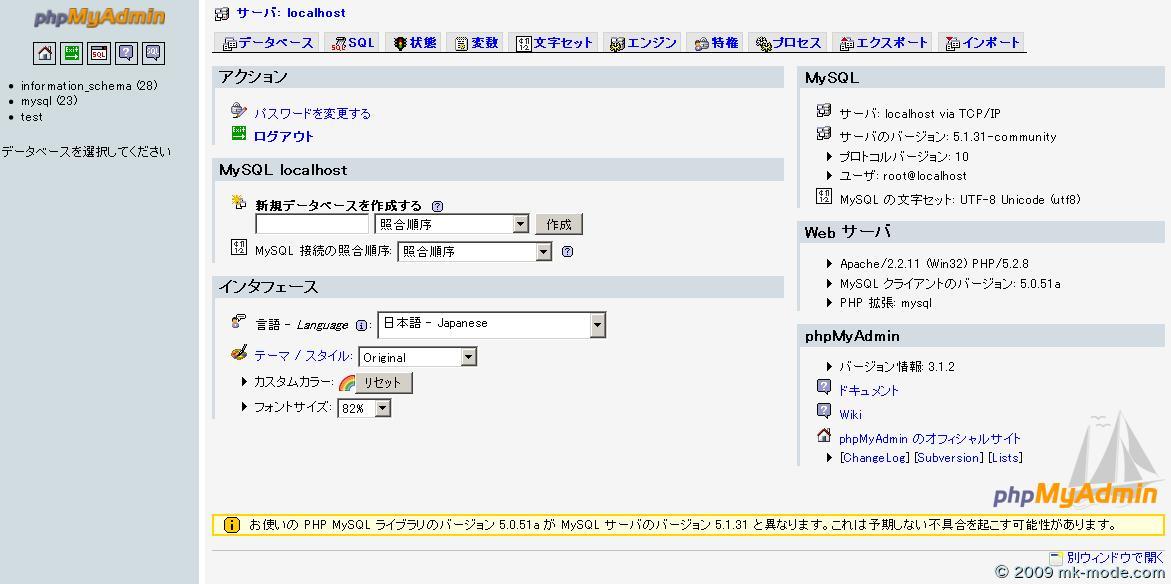 警告「 お使いの PHP MySQL ライブラリのバージョン 5.0.51a が MySQL サーバのバージョン 5.1.31 と異なります。これは予期しない不具合を起こす可能性があります。 」などとでいる。 アレコレ調べてみると、おそらくMySQLのバージョンが新しいからダメみたい。