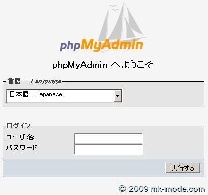Webサーバ(当方はApache2)を再起動。 ブラウザより http://localhost/phpmyadmin/index.php (当方の場合)にアクセスしてみる。