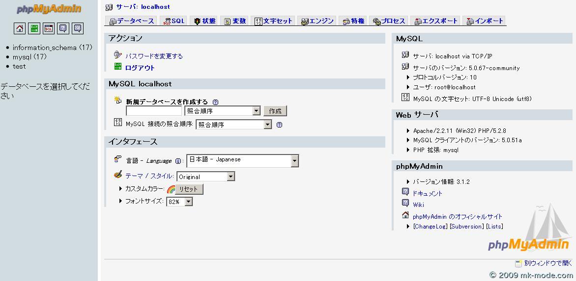 ユーザ名・パスワードにMySQLのユーザ名・パスワードを入力して、「実行する」ボタンをクリックする。 (ここでは、まだ”root”ユーザしか存在しないので、”root”ユーザでログインします) 成功すれば、以下のような画面が出るはずです。