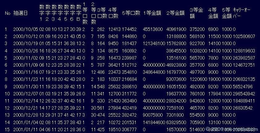 | ".$No." | "; echo "".$抽選日." | "; echo "".$数字1." | "; echo "".$数字2." | "; echo "".$数字3." | "; echo "".$数字4." | "; echo "".$数字5." | "; echo "".$数字6." | "; echo "".$数字B." | "; echo "".$1等口数." | "; echo "".$2等口数." | "; echo "".$3等口数." | "; echo "".$4等口数." | "; echo "".$5等口数." | "; echo "".$1等金額." | "; echo "".$2等金額." | "; echo "".$3等金額." | "; echo "".$4等金額." | "; echo "".$5等金額." | "; echo "".$キャリーオーバー." | "; echo "