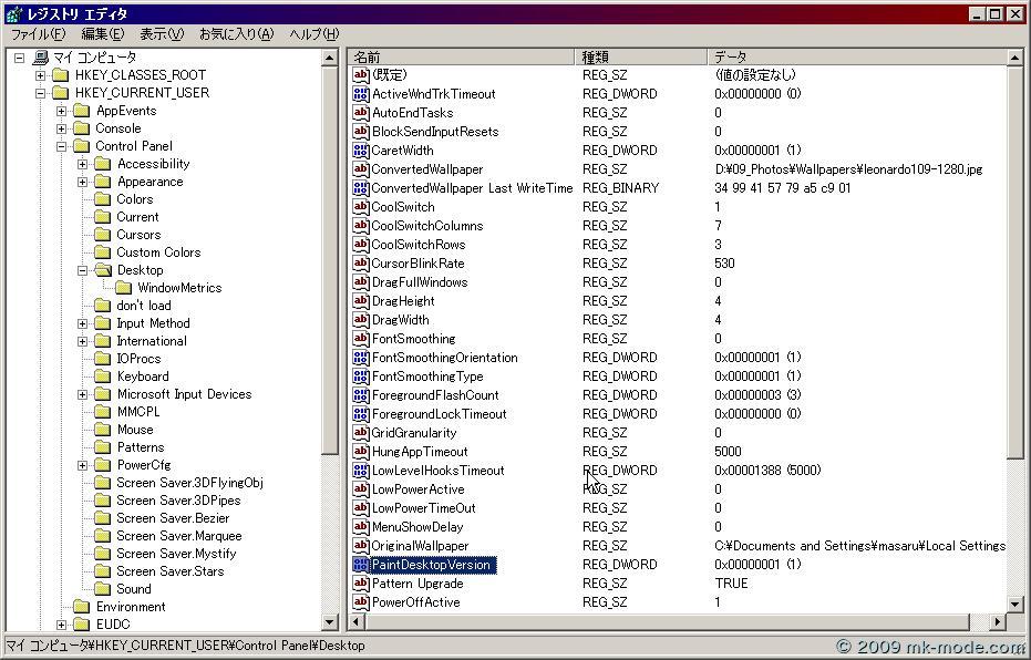 レジストリ キー 「 HKEY_CURRENT_USER\Control Panel\Desktop 」 を探っていって、 「 PaintDesktopVersion 」値の場所を見つけたらクリックする。
