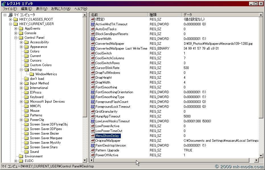 レジストリ キー 「 HKEY_CURRENT_USER\Control Panel\Desktop 」 を探っていって、 「 MenuShowDelay 」値の場所を見つけたらクリックする。