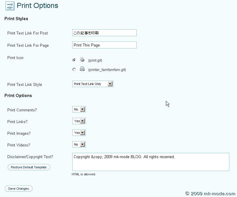 WordPressの 「 設定 」-「 Print 」画面で各種設定をする。