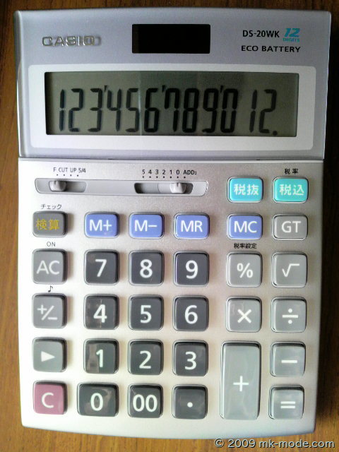 ということで、 今まで使っていた電卓とキー配列が同じで税計算・検算機能がついてて、早打ちできるヤツで横幅が今までのものと同じモデルを調べてみたら、「 DS−20WK 」というのが一番自分に合ってる。 ※税計算キー部分・色合い以外はほとんど同じ。 多分、今まで愛用してた電卓の後継機の系統です。