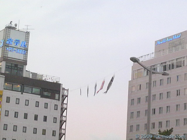 これは、うちの地元の市内にあるホテルの本館と別館を結んだ「 こいのぼり 」でした。。 初めて見たって感じだし、ちょうど信号待ちでいい角度だったんで思わず撮影しました。