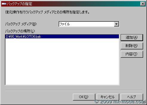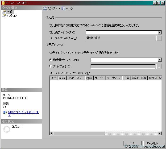 3.「 復元先データベース 」にデータベースの名前を入力して、バックアップファイルから復元するので、「 デバイスから 」を選択し、ファイル選択の画面を開く。