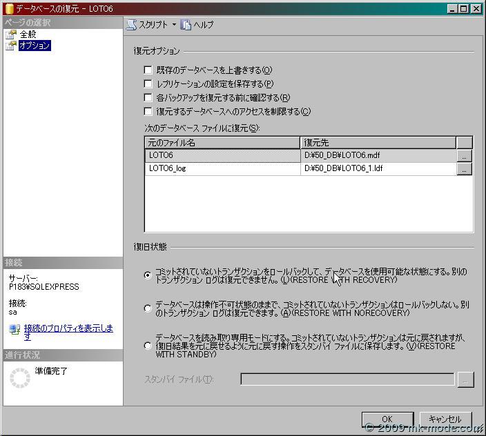 5.オプションの画面で、データベースの復元先を確認・変更する。(その他はデフォルトのままで)