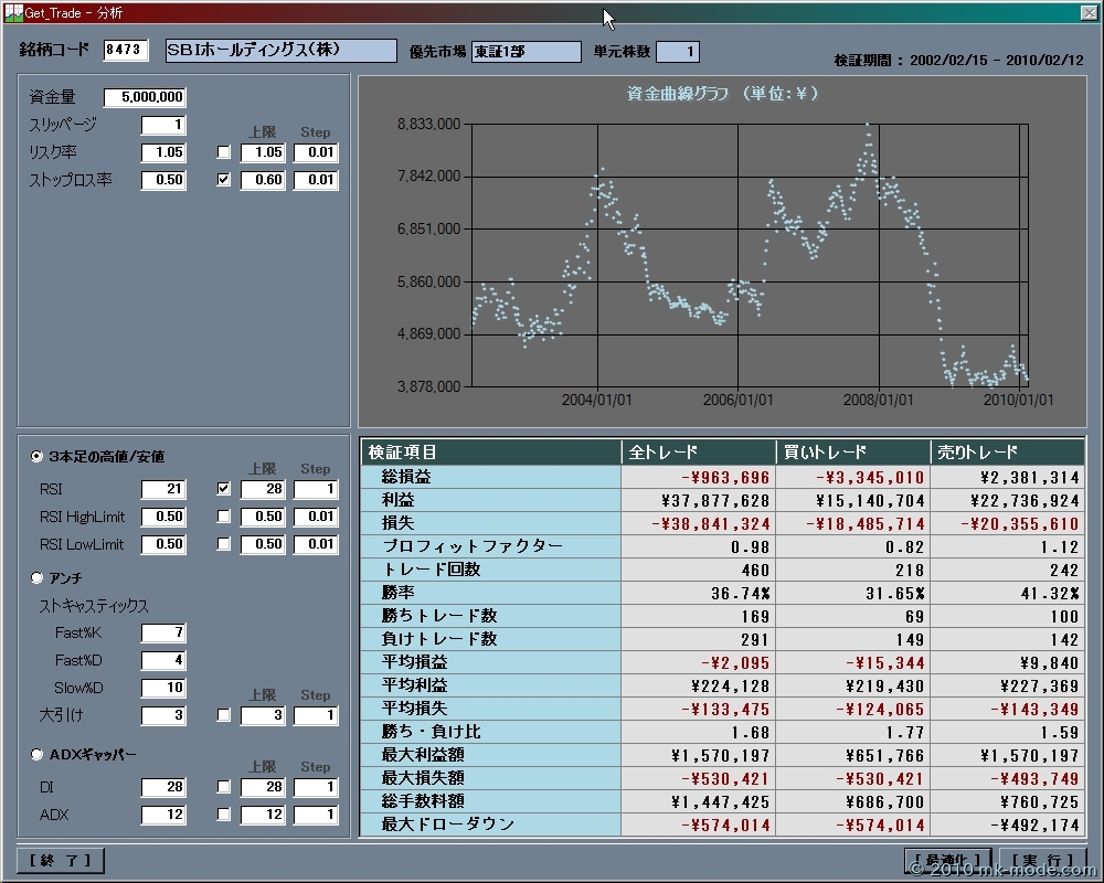 で作成中のシステムトレーディングシステムで、売買手法のロジックを組み込み、さらにそれを検証するための画面も作成しました。