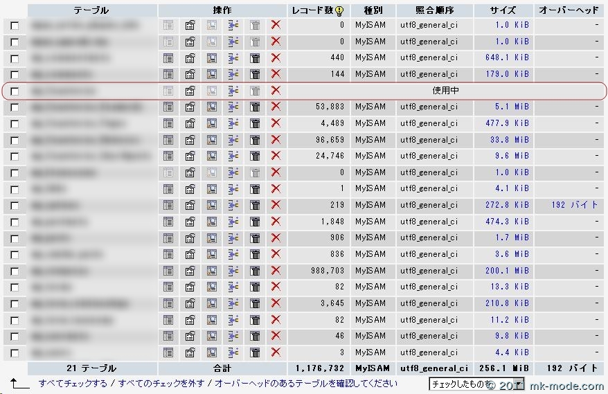 phpMyAdminで確認してみると、対象のテーブルのみ使用中となっています。