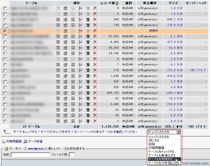 このテーブルをチェックして「テーブルを修復する」を選択します。