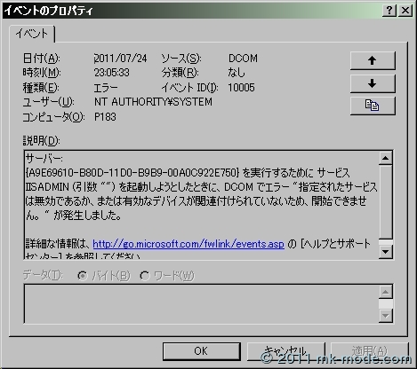 起動時のメッセージボックスは表示されなくなり、イベントビューアにもこのエラーは出力されなくなりました。 やっぱり、IIS Admin サービスのスタートアップは「自動」でなくて「手動」でも大丈夫みたい。
