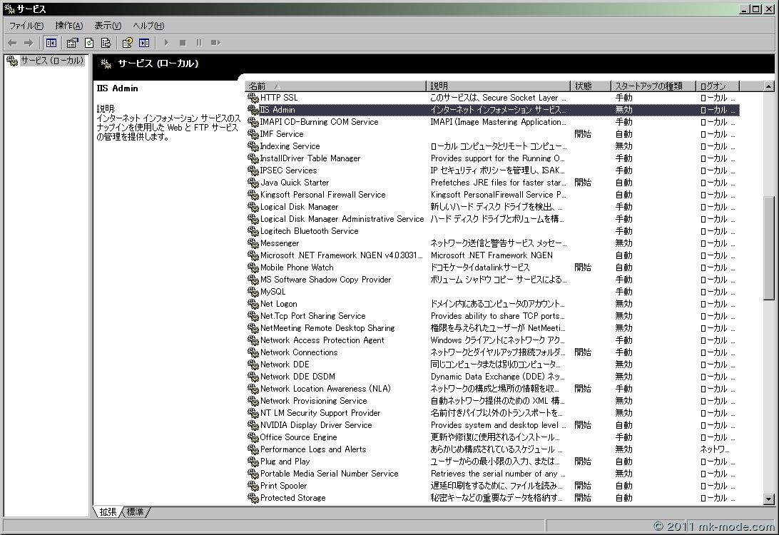 確かにサービスを確認してみると、IIS Admin サービスのスタートアップの種類が「無効」になっている。