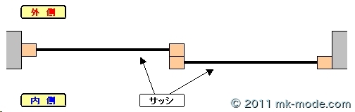 通常、ガラスサッシ(窓ガラス)は右側が手前、左側が外側に配置されているはす。
