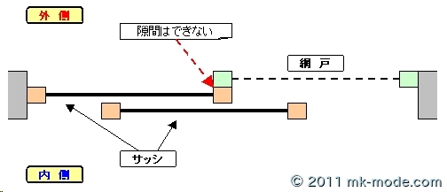 網戸を左側にした場合でも、ガラスサッシを目いっぱい開けた場合は隙間が無くなる場合もありますが、大抵は少なからず隙間はできます。