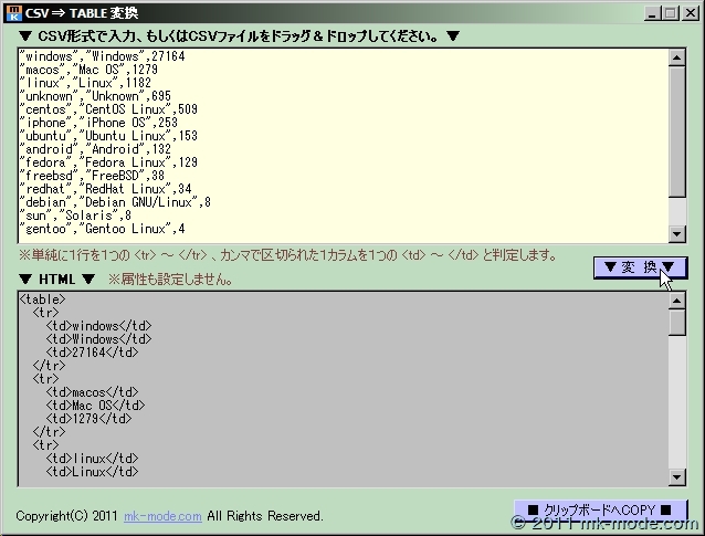 - 単純に1行ずつ <tr>・</tr> で囲み、カンマが有ればそこで区切って <td>・</td> で囲んでいるだけです。