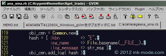 エディタ上部にタブバーを表示する設定をするため、設定ファイル “gvimrc” に以下の記述を追加します。
