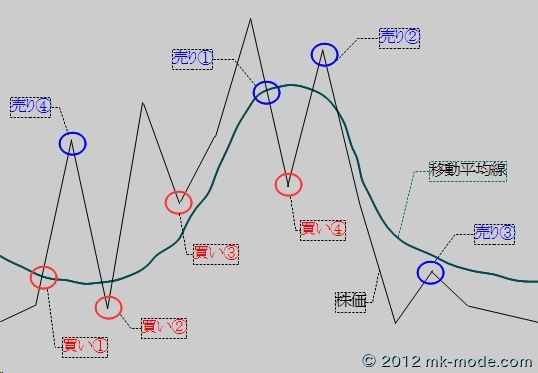 - 移動平均線が下向きの状況下で、 株価が移動平均線付近のところまで上昇し反落したら売り。 (戻り売り)