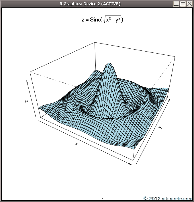 f <- function(x, y) { r <- sqrt(x^2+y^2); 10 * sin(r)/r }