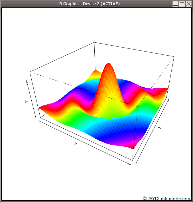 persp(x, y, z, theta = 30, phi = 30, expand = 0.5, col = rainbow(50), border=NA)