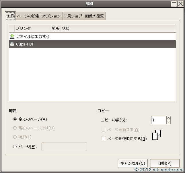 他にも PDF 出力するソフトは多数存在しますが、Linux 使いにはこの Cups-PDF が定番でしょうね。