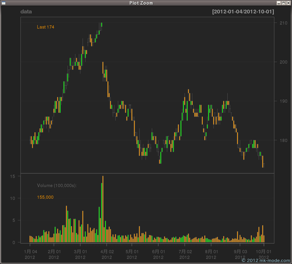 今日は、RStudio で株価の CSV データを読み込んでローソク足チャートを描画してみました。