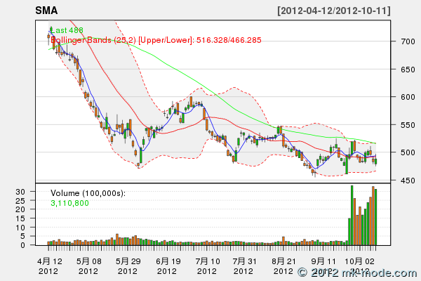 他にも、オプションを設定することで色々なグラフが描画可能です。 以下は、背景を白色にし、ローソク足+出来高+単純移動平均(5日,25日,75日)+ボリンジャーバンド(単純移動平均日数=25日・σ=2)を描画したもの。