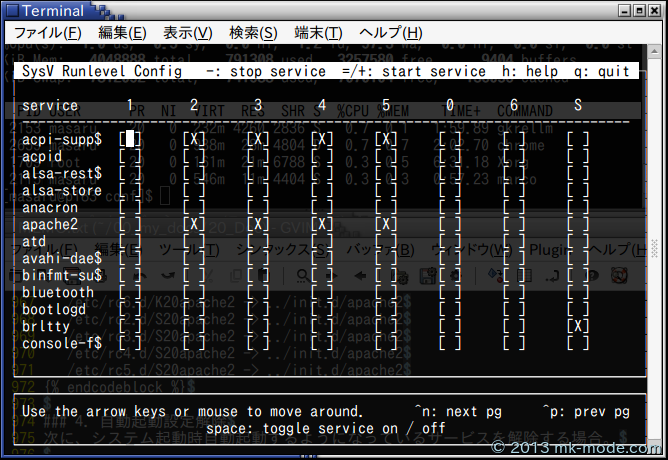 視覚的に、また詳細にランレベルを設定したいなら、sysv-rc-conf という「端末用 SysV init ランレベル設定ツール」を使うとよい。