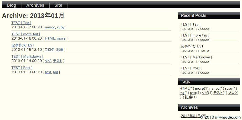 - nanoc 用ブログヘルパー(Blogging, Rendering, LinkTo, Tagging)のインクルード設定済み。