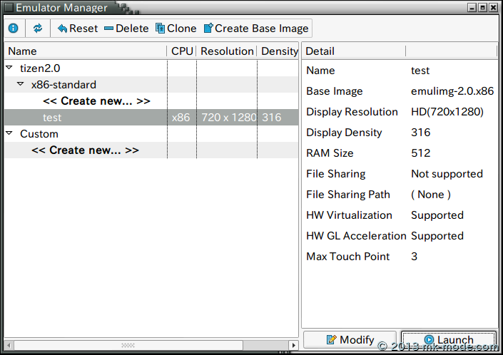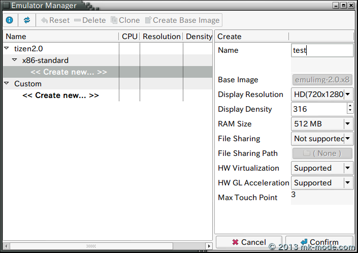 「tizen2.0」-「x86-standard」の「« Create new… »」をクリックし、「Name」に取り敢えず test と入力して、「confirm」ボタンをクリックする。