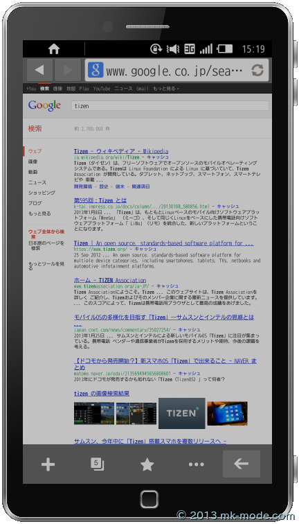 以下は日本語設定した後、Google で Web 検索してみた際の画面。