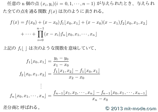アルゴリズムとしては、係数(差分商)を求め、求まった多項式から補間点を算出していく形になる。