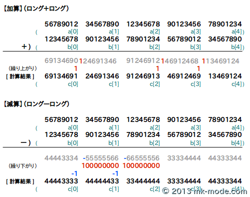 - 減算・・・下位の配列から減算していき、結果が負になったら上位から1借りて加算する。