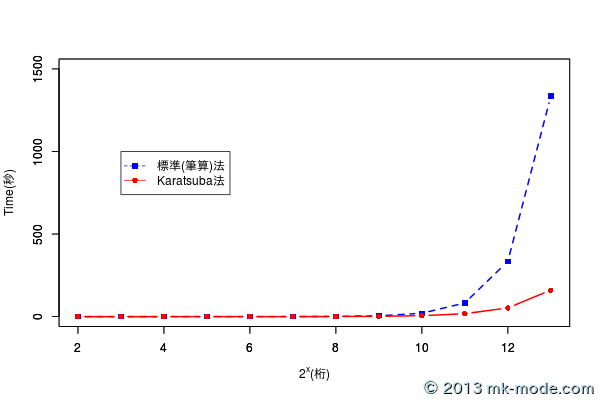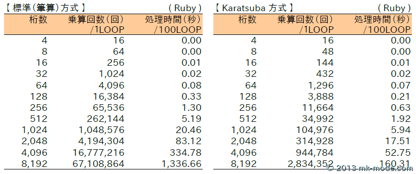 Ruby では “Bignum” クラス内で「Karatsuba 法」を使用している部分もありますが、今回のような方法も理解していおいて無駄ではないでしょう。