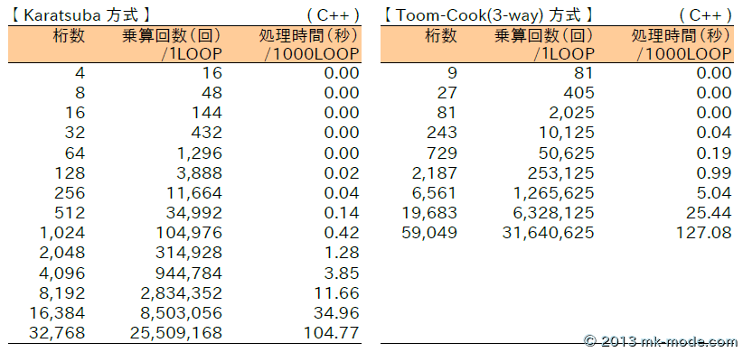 ちなみに、「Karatsuba 法」の計算量は \(O(n ^{1.585})\) で、「Toom-Cook 法(3-way)」の計算量は \(O(n ^{1.465})\) である。