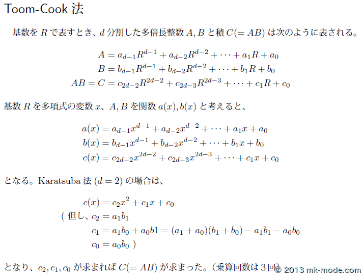 ちなみに、同程度の桁数同士で、3分割して考える方法を「Toom-Cook 法(3-way)」と言う。(3分割×2分割や4分割×4分割等の考え方もある)