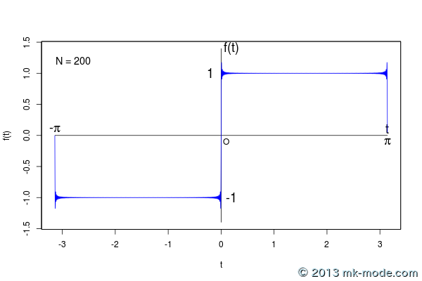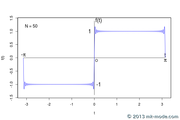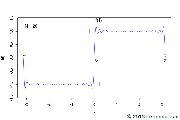 さらに、与えられた関数がフーリエ級数の部分和で近似されるとき、項数をいくら増やしていっても、不連続点の近傍で誤差が生じる。これを「ギップス現象」という。