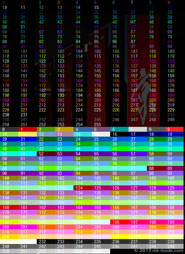 colour0 - colour255 がどんな色かは以下のようなシェルスクリプトを実行することで確認可能。