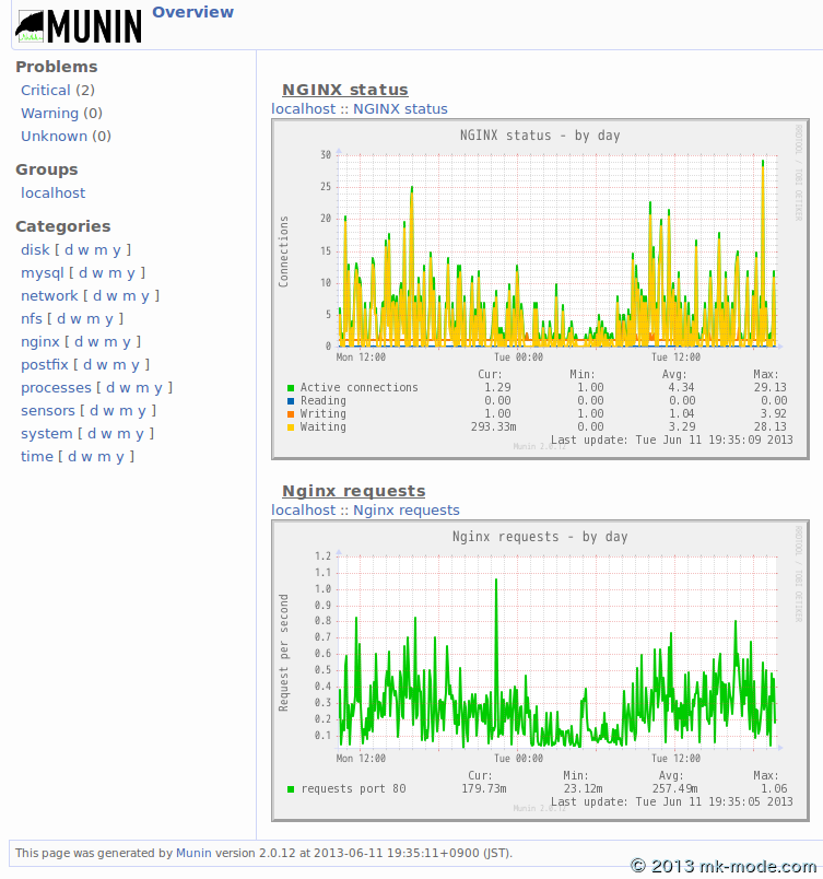 ソースをコンパイルしてインストールする場合は、--with-http_stub_status_moduleオプションを指定してコンパイルすること。 - munin がインストール済みである。