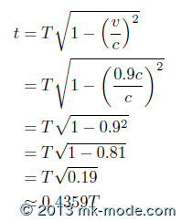 例として、光速の 90% の速度の乗り物に乗って宇宙旅行に出かけ、1年後に地球に戻ってきたらどのくらい時間が遅れているかを計算してみる。