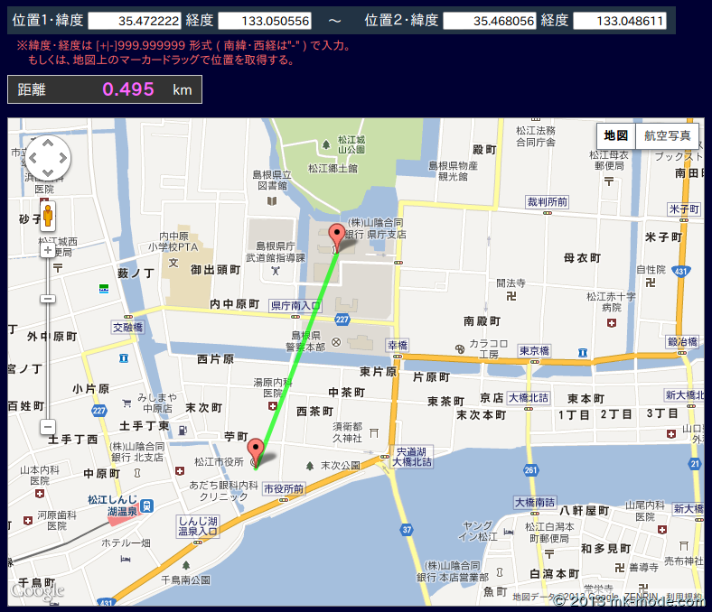 2点の緯度・経度は直接入力する他、Google マップ上に配置したマーカーからも取得できるようにしました。