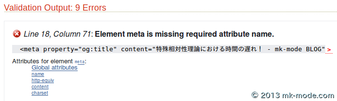 metaタグを埋め込んでいる。 - 今まで W3C Validation チェックで正当(Valid)な HTML として判定されていたのに、6月24日くらいから不正(Invalid)な HTML と判定されるようになった。