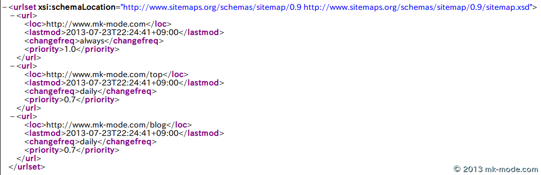 <?xml version="1.0" encoding="UTF-8"?><urlset xmlns:xsi="http://www.w3.org/2001/XMLSchema-instance" xmlns:image="http://www.google.com/schemas/sitemap-image/1.1" xsi:schemaLocation="http://www.sitemaps.org/schemas/sitemap/0.9 http://www.sitemaps.org/schemas/sitemap/0.9/sitemap.xsd" xmlns="http://www.sitemaps.org/schemas/sitemap/0.9" xmlns:video="http://www.google.com/schemas/sitemap-video/1.1" xmlns:geo="http://www.google.com/geo/schemas/sitemap/1.0" xmlns:news="http://www.google.com/schemas/sitemap-news/0.9" xmlns:mobile="http://www.google.com/schemas/sitemap-mobile/1.0" xmlns:pagemap="http://www.google.com/schemas/sitemap-pagemap/1.0" xmlns:xhtml="http://www.w3.org/1999/xhtml"><url><loc>http://www.mk-mode.com</loc><lastmod>2013-07-23T22:24:41+09:00</lastmod><changefreq>always</changefreq><priority>1.0</priority></url><url><loc>http://www.mk-mode.com/top</loc><lastmod>2013-07-23T22:24:41+09:00</lastmod><changefreq>daily</changefreq><priority>0.7</priority></url><url><loc>http://www.mk-mode.com/blog</loc><lastmod>2013-07-23T22:24:41+09:00</lastmod><changefreq>daily</changefreq><priority>0.7</priority></url></urlset>