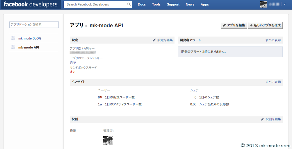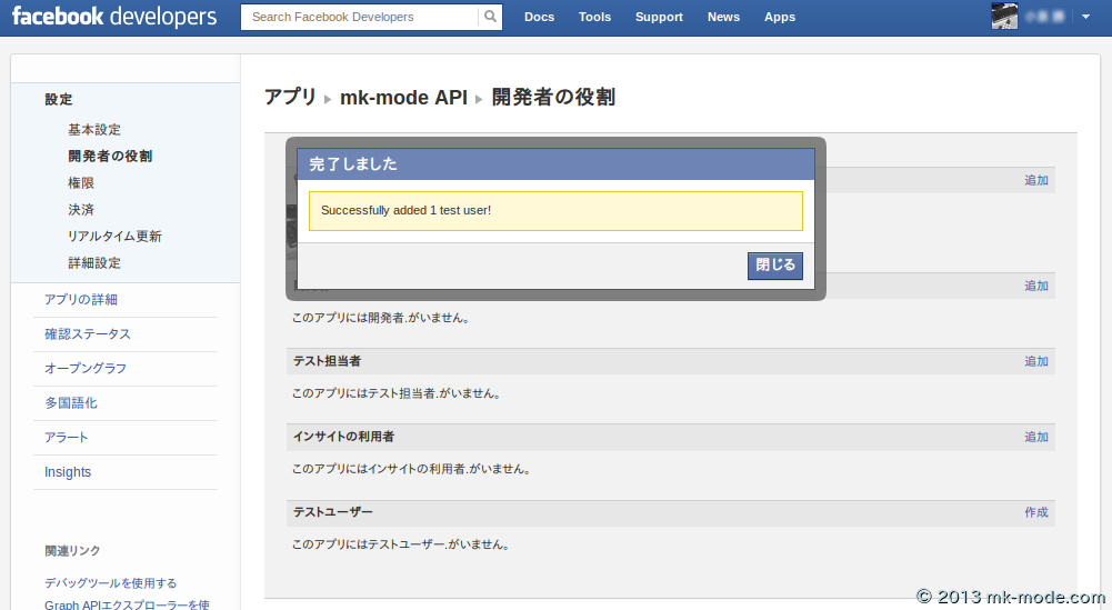 これで、Facebook アプリ開発の際にアクセス制限を気にすることなく思う存分テストができるかと思います。
