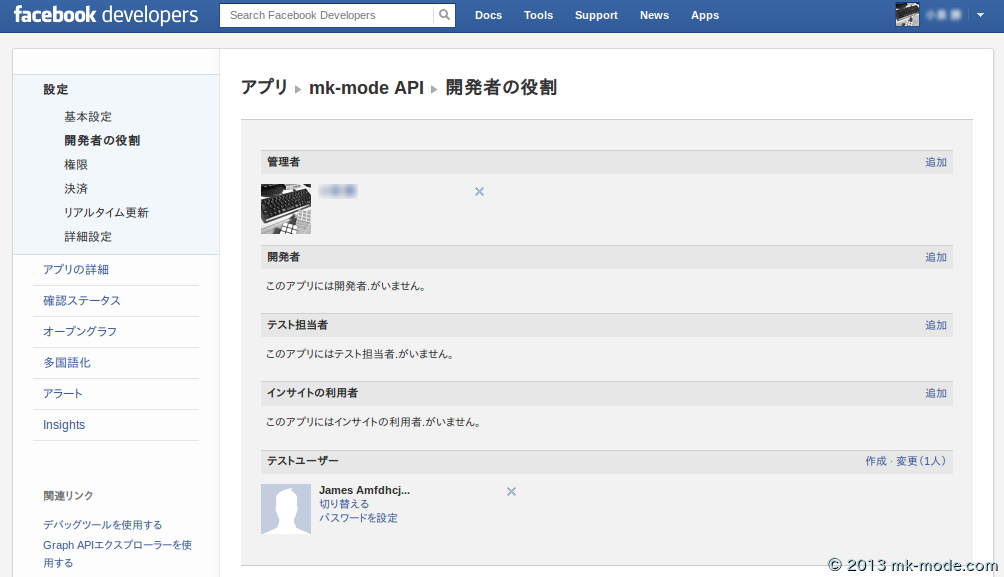 そこで、Facebook にはテストユーザーという Facebook アプリに紐付いたテスト専用のアカウントを作成することが可能になっています。