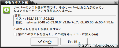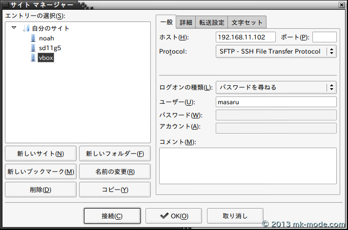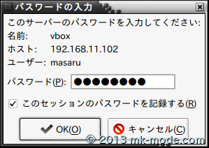 「接続」ボタンクリックで、「パスーワード入力」、「鍵認証」を経てログインできるはず。