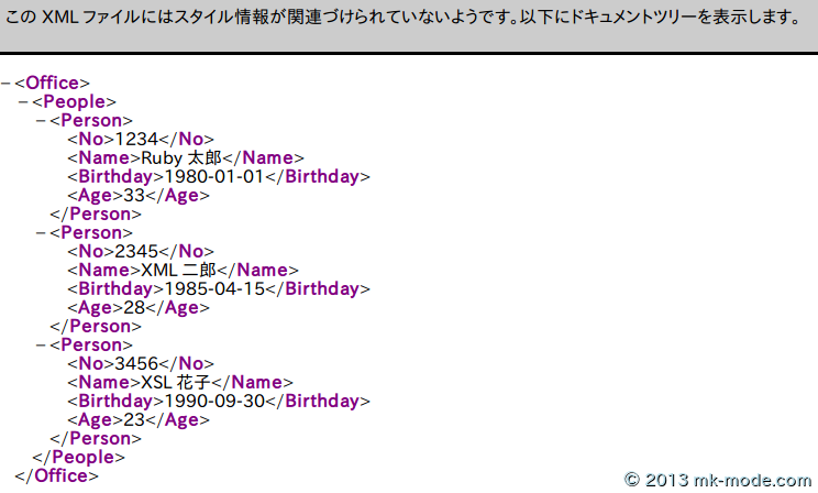 XSLT スタイルシート未適用の XML ファイルは、ブラウザで表示すると以下のようになりますが、