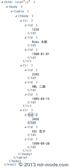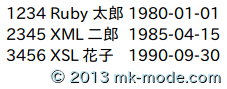 <tr><td>1234</td><td>Ruby 太郎</td><td>1980-01-01</td></tr>