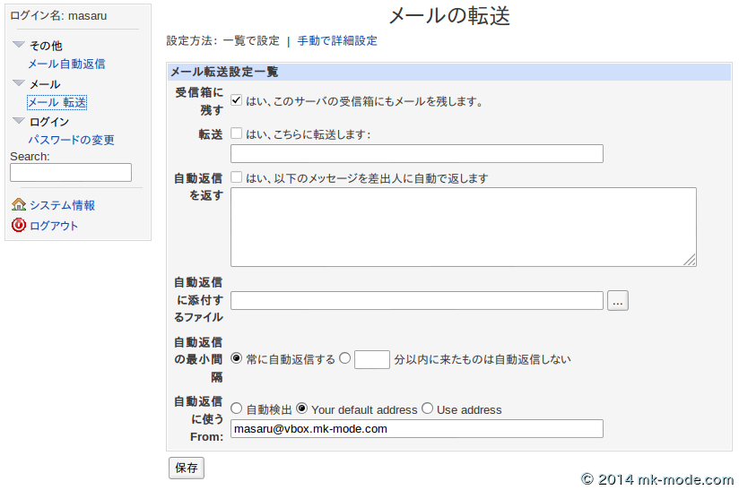 ブラウザで https:/<サーバ名>:20000/ にアクセスし、メニューに「メール転送」が追加されていること、正常に動作することなどを確認する。
